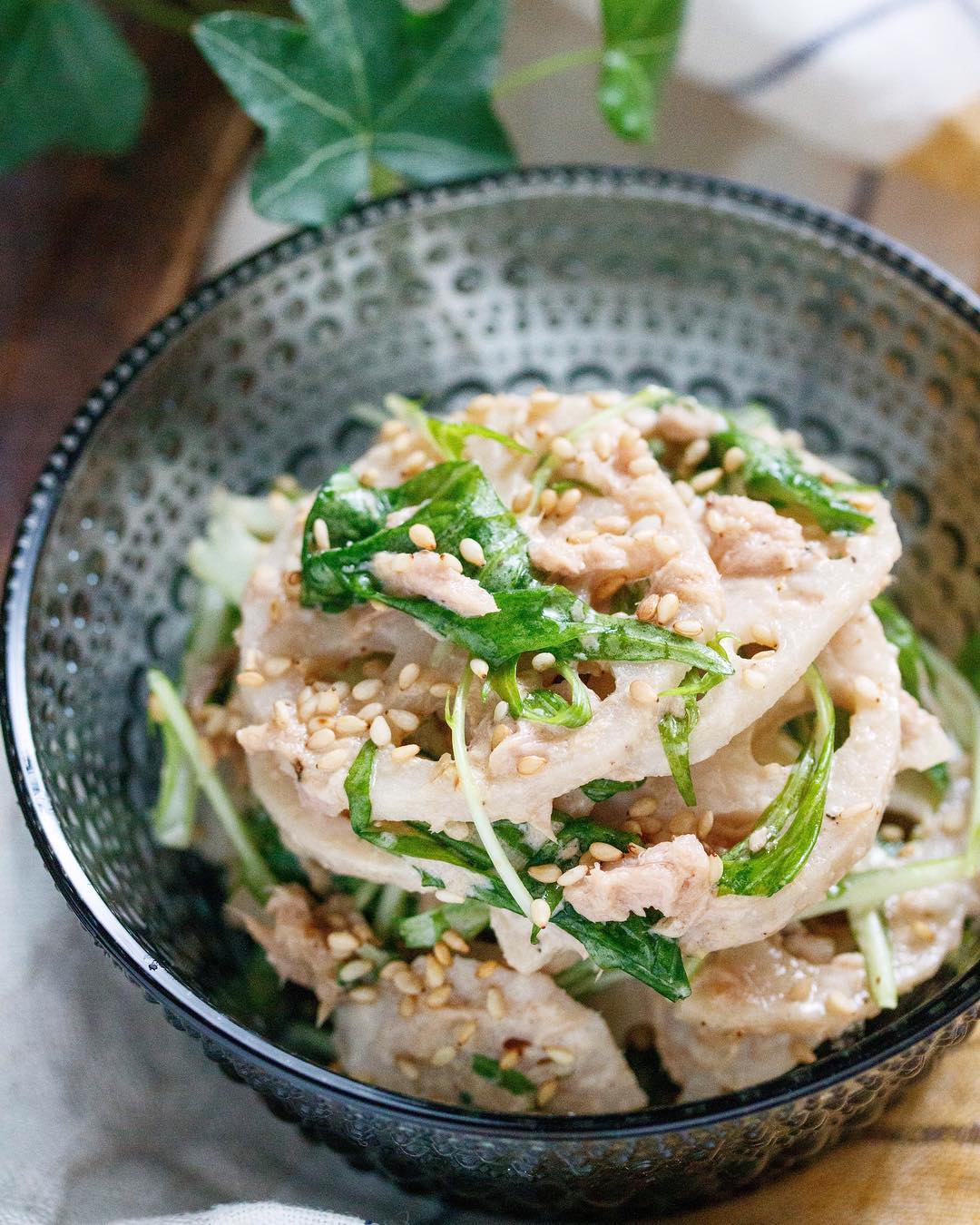 #簡単 #簡単レシピ #レシピ #節約 #時短 #時短レシピ #作り置き #お弁当 #food #recipe #cooking #料理好きな人と繋がりたい #器好き #器 #写真好き #楽うま #おかず #自分時間 #自分磨き #自分らしく #れんこん #水菜 #ツナ缶 #サラダ #ごまマヨ #蓮根