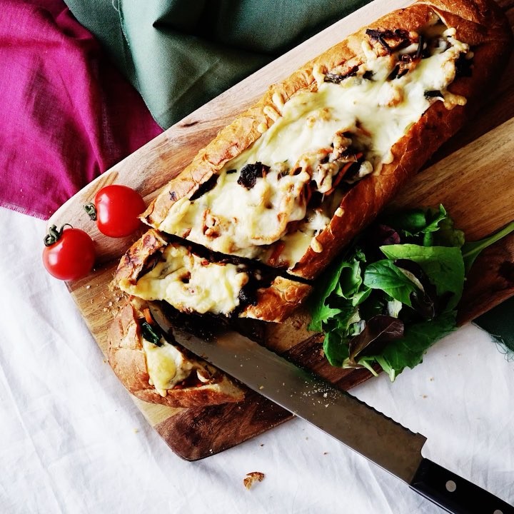 3.フランスパンに切り込みを入れ、トングで中身を取り出す。その部分にチーズを入れた後、2を詰め上からチーズをかける。