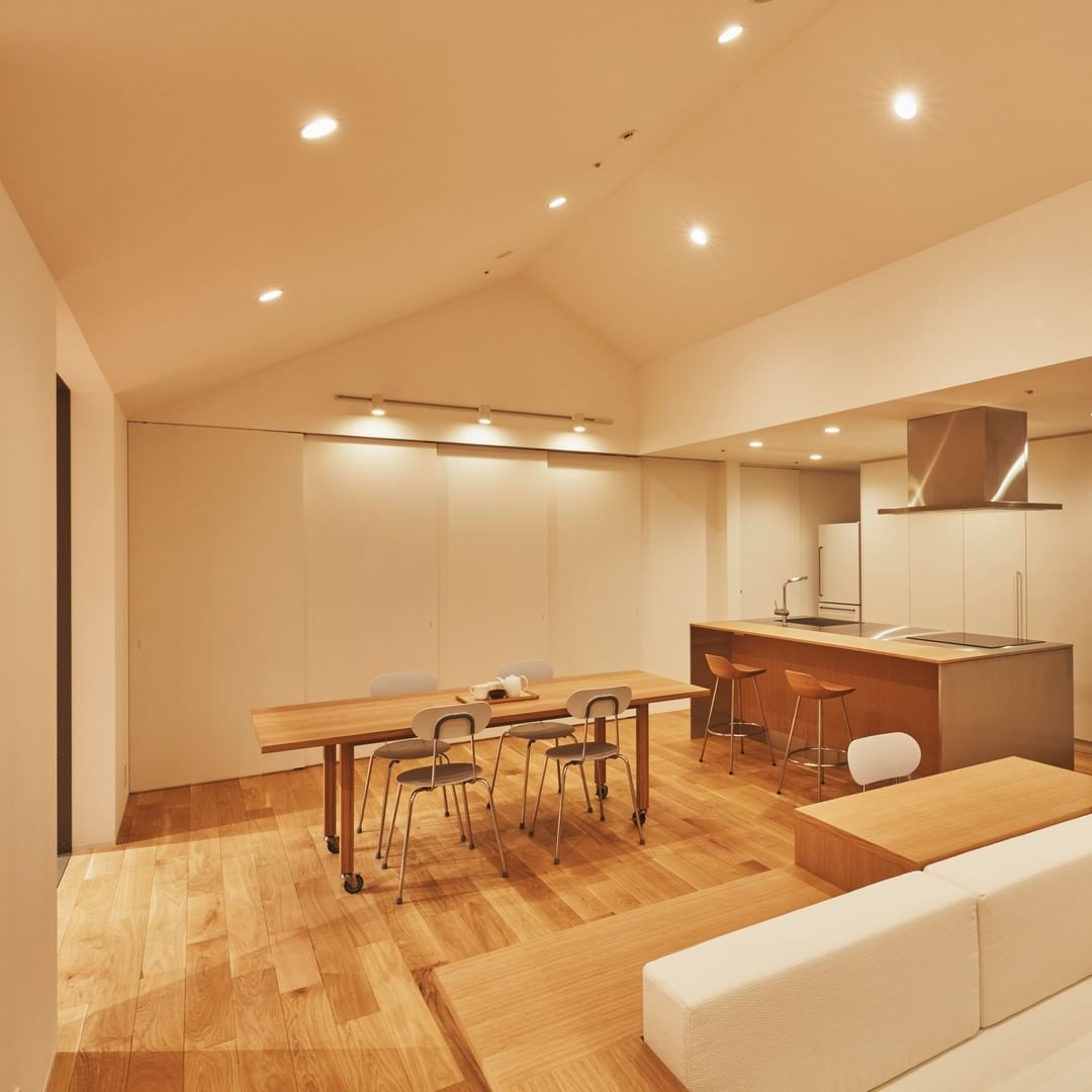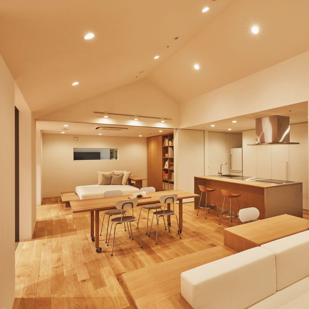 リビングは勾配天井を採用。平屋でありながら圧迫感を感じない広々とした空間が広がります。主寝室との間には間仕切り戸を設置。簡単にプライベート空間をつくることができます。