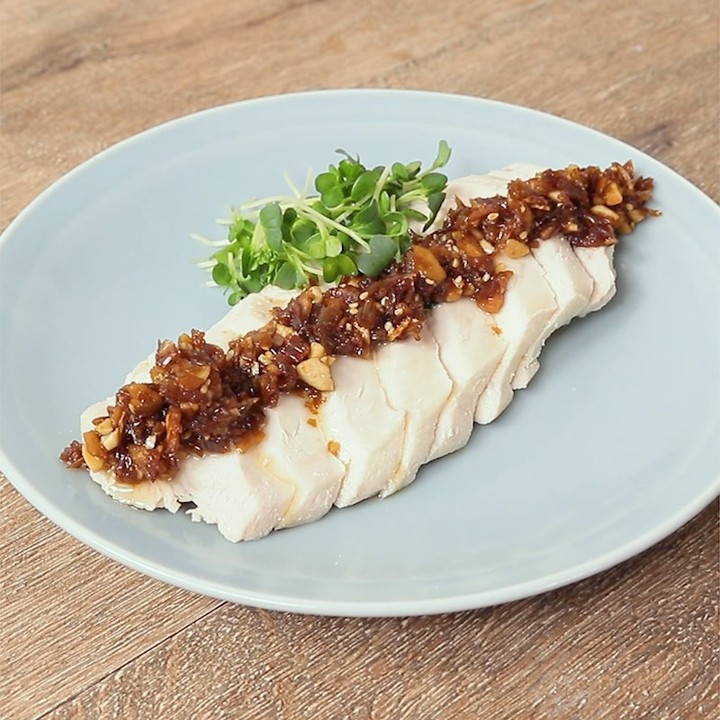 レンジで簡単に蒸し上げた鶏肉に、ざくざく食感がたまらない食べるしょうゆをかけていただきます。あっさりと淡白な鶏むね肉に、風味豊かなタレがよく合いますよ。お好みでラー油をかけてもおいしくお召し上がりいただけますよ。ごはんのおかずにピッタリです。