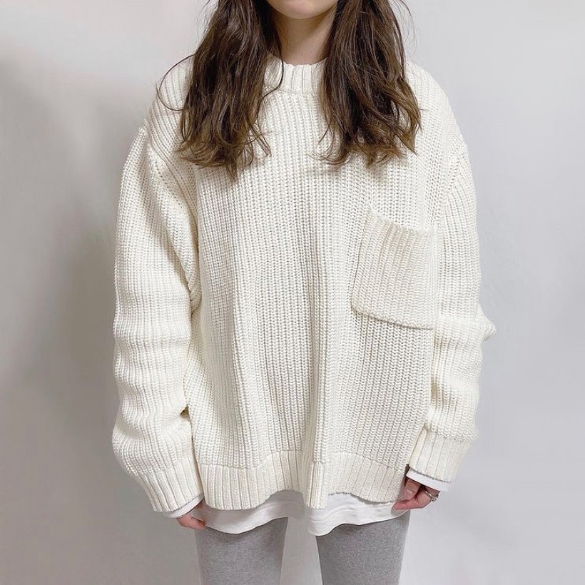 ワイドなデザインが、ゆる可愛いシルエットを作ってくれるセーター✨丈は少し短めで作られているので、女性でもちょうどいいレイヤードが作れますね👏とっても素敵です😘クルーネックが、大人っぽく着こなせるのもポイントです👌大きめのポケットがアクセントで、リラックスコーデが楽しめるセーター🙌