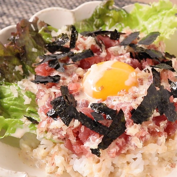 4. 器にごはんをよそい、サニーレタスを敷き、2を盛り付けます。卵黄をのせ、3をかけ、1とのりを散らして完成です。