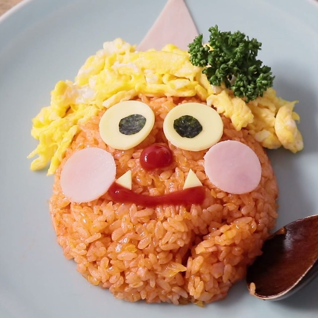 6. お皿に5を顔の形に、4は髪の毛の形に盛り付け、2、3で作ったパーツをそれぞれ配置し、ケチャップで鼻と口を書きます。