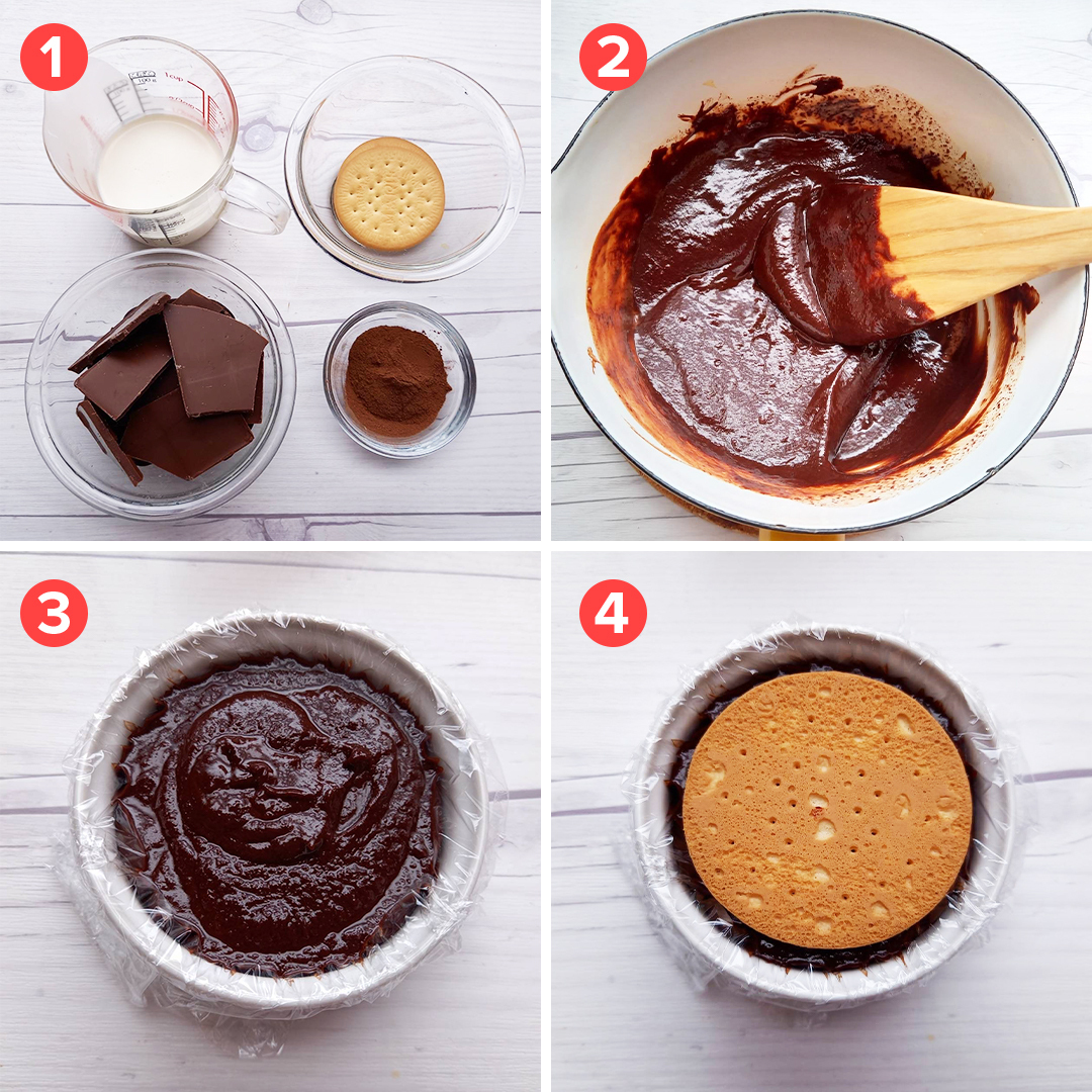 3.(1)が人肌まで冷めたら(2)に注ぎ入れ、ビスケットを置く。