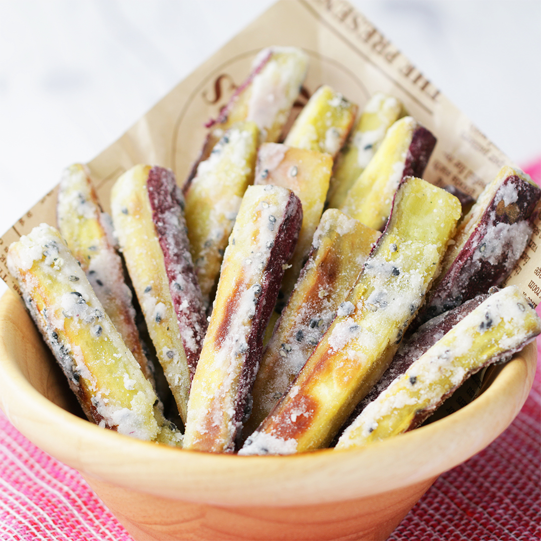 1.さつまいもは1cm幅のスティック状に切り、5分ほど水にさらして水気をしっかりと切りペーパーで拭く。耐熱皿にのせ600Wの電子レンジで3~4分で加熱する。⁣