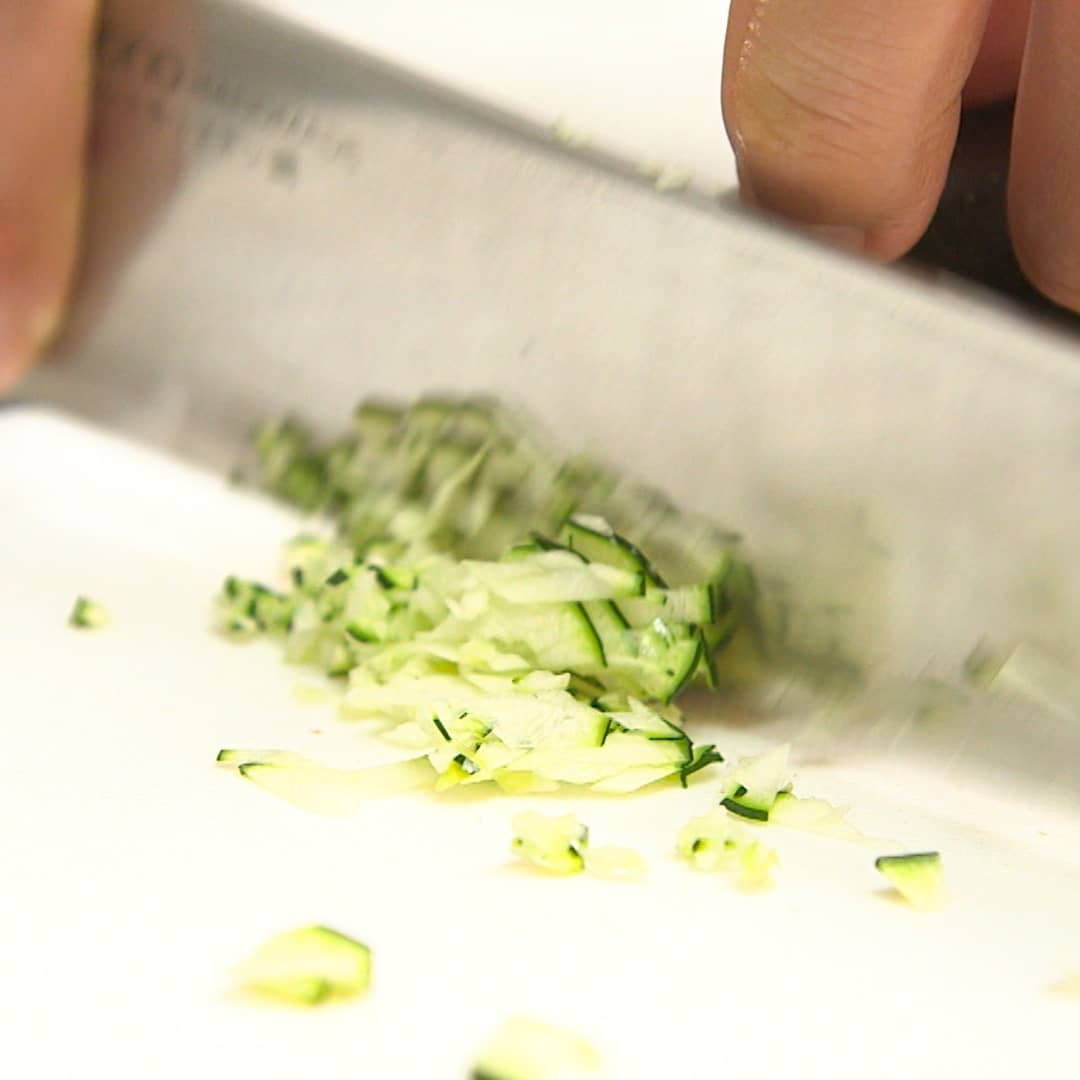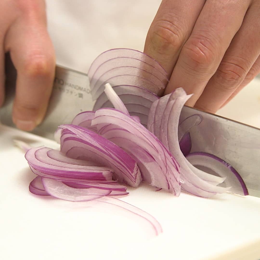 ①赤パプリカ(1/4)、紫玉ねぎ(1/4)、マッシュルーム(1個)を薄切りに、ズッキーニ(20g)をみじん切りにする