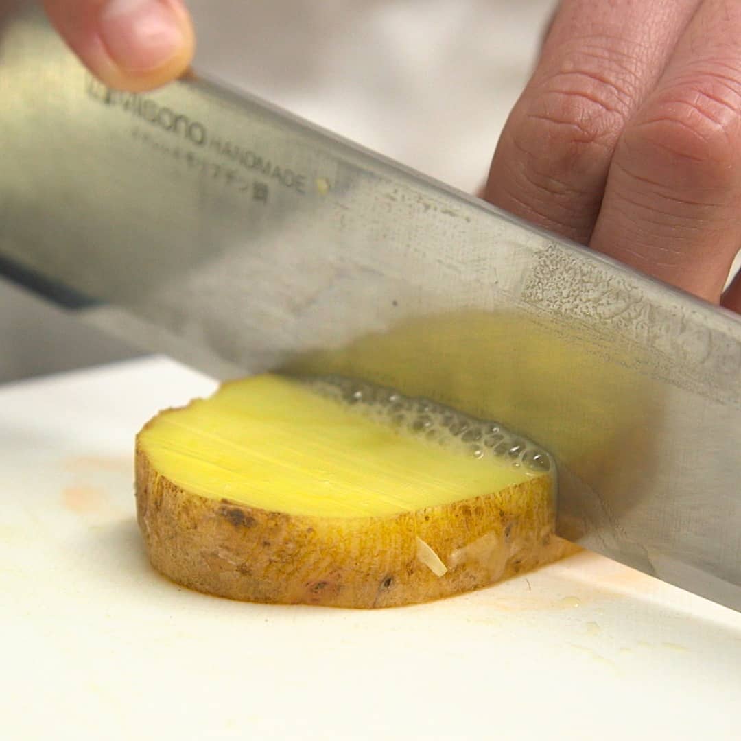 ⑤切りきらないように注意し、じゃがいもに千切りのようにまっすぐ切れ目を入れていく