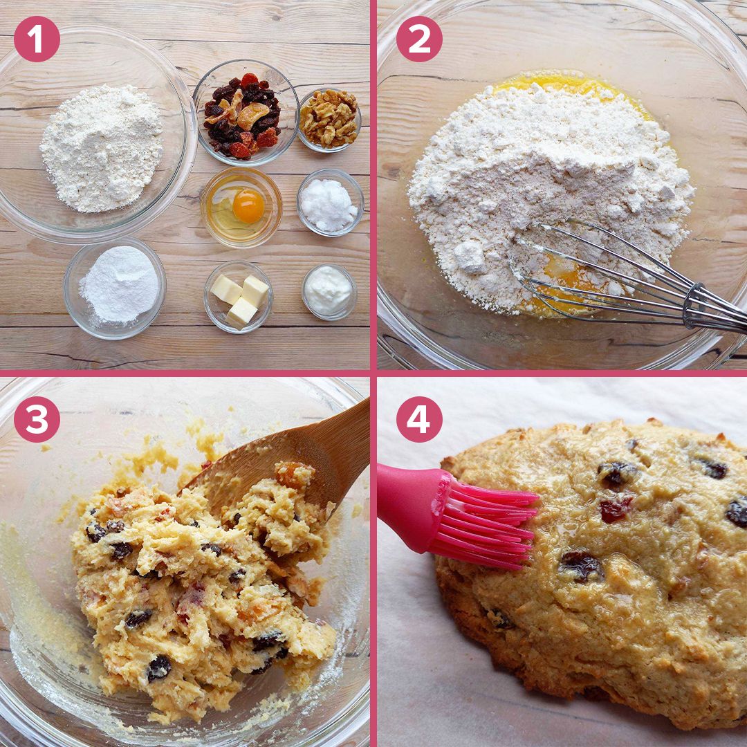 3.(2)に刻んだくるみとドライフルーツを加えて、ゴムべらで混ぜる。
