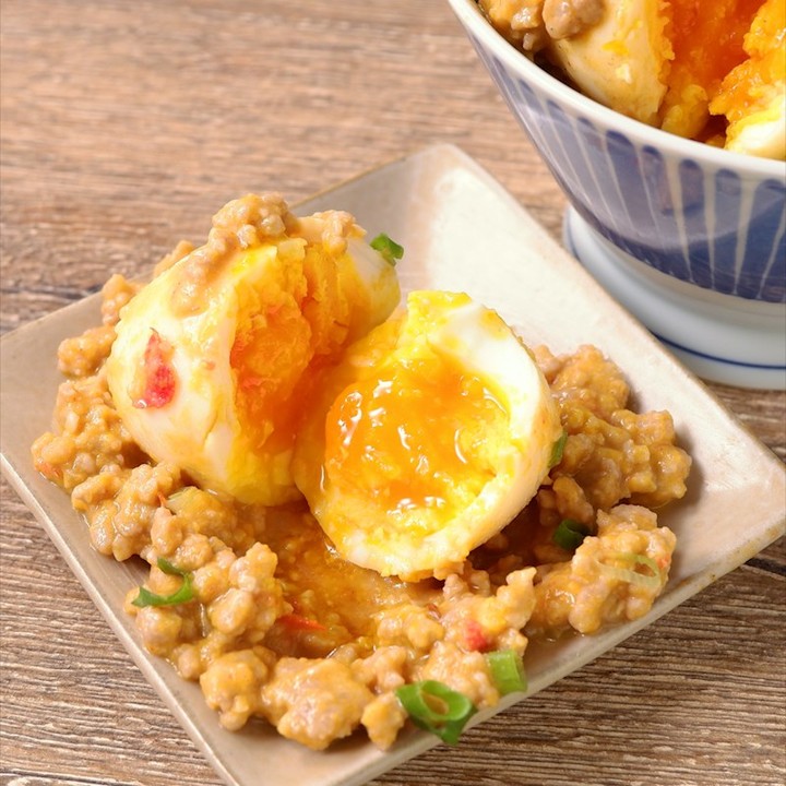 坦々風味の辛味のある肉みそで漬け込んだ半熟ゆでたまごはいかがでしょうか。豆板醤のピリッとした辛味に山椒のさわやかな辛さが食欲をそそります。白ねりごまでまろやかで濃厚に仕上げた漬けそぼろをたっぷりと卵と一緒にお召し上がりください。豪快にごはんにのせていただくのもおすすめです。