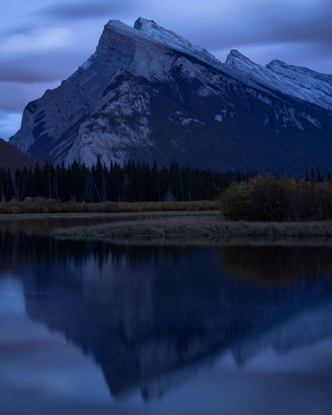 Photo by @paulzizkaphoto “Blue hour at Mount Rundle. Autumn oranges fade into cooler nighttime hues at Vermilion Lakes, Banff National Park, Canada. I was blown away by the sharpness of the RF70-200mm F4 L IS USM once again and won’t hesitate printing this one big.”