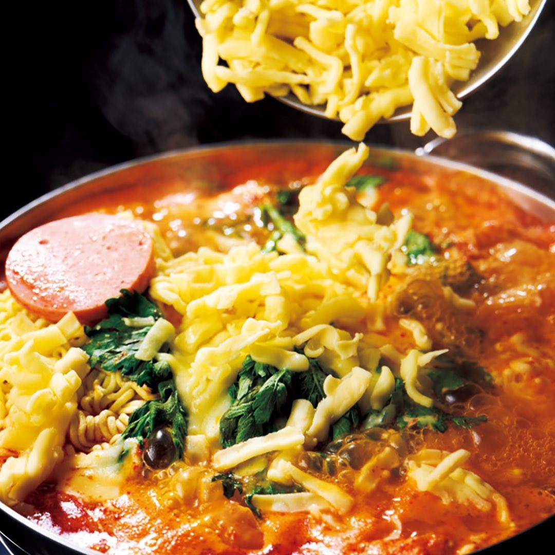 ①たっぷりの野菜とスパムが入った韓国の定番鍋、「 #プデチゲ 」。肉や野菜の出汁をよく吸ったラーメンがたまらない禁断のグルメだ