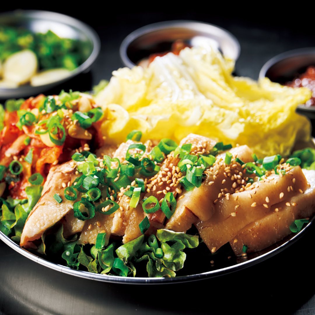 ②余分な脂を落とした国産豚の三枚肉を白菜で包んでいただく「 #ポッサム 」。