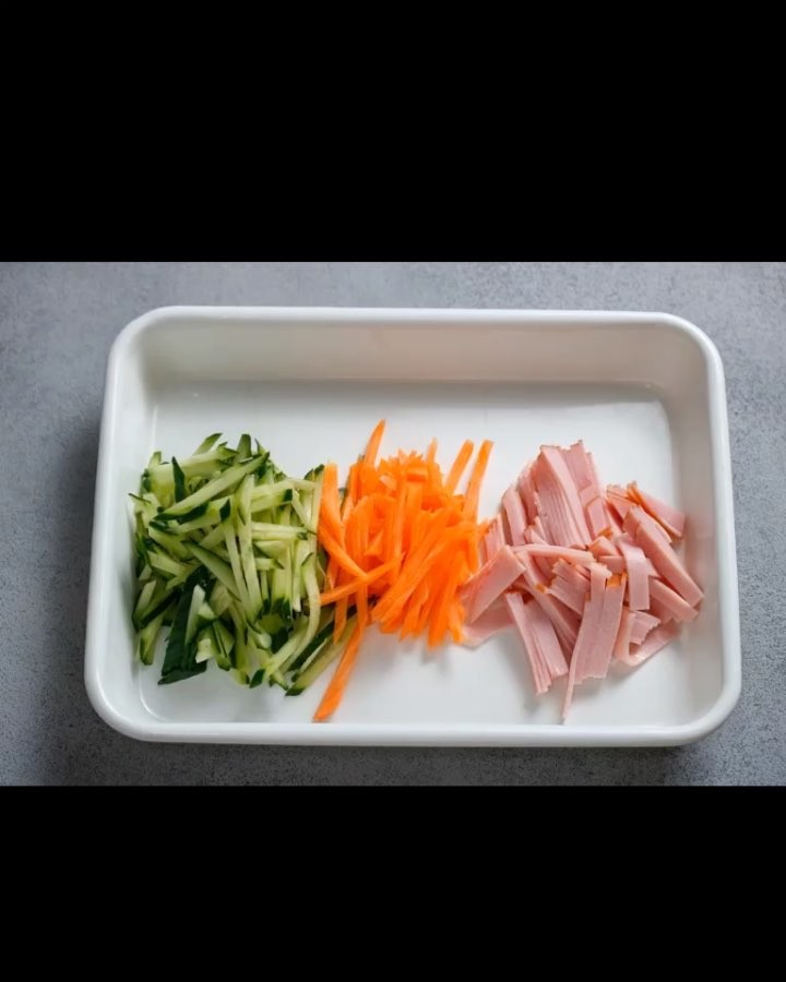 ①にんじん・きゅうりは千切りに、ロースハムは、細切りにする。