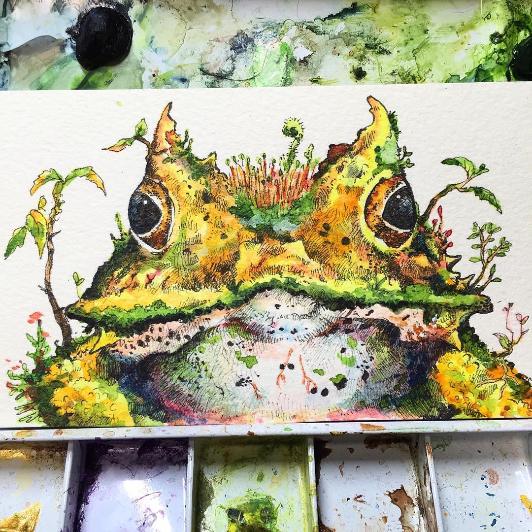 「動物の個性的で突拍子もない見た目や色、姿形に強い個性を感じて惹かれるようになりました。特に魚や両生類などは予想の遥か上の造形をしたものが多く、見るたびワクワクします」今にも動き出しそうな緻密な生き物のイラストを描くマツダケン (@keso1005) さん。会社員として働く傍ら、帰宅後や休日に作品制作に没頭しているという。名刺大のミニ原画の制作は3時間、A4などサイズがあるものは3〜4週間かかることもある。「没頭できる理由としては絵が私の唯一のプライドであるということと、描いてみたいモチーフとの出会いが日に日に増え、尽きないところだと思います」作品を写真や動画にしてシェアするようになってからは、制作依頼や展示の誘いが舞い込むようになったと言う。「今後はとにかく大きい作品を描きたいと思っています」
