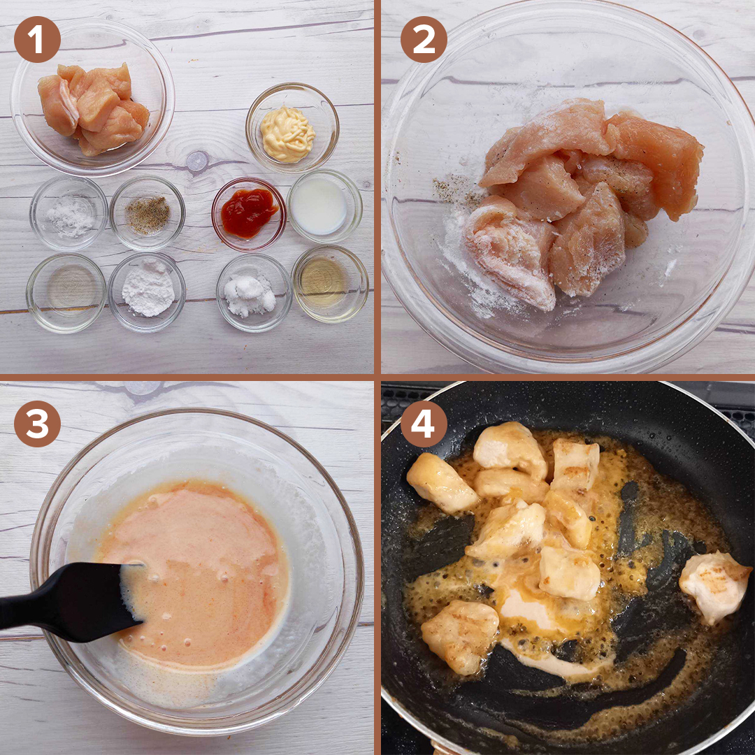 1.鶏むね肉は食べやすい大きさに切り、酒、塩コショウ、片栗粉を揉み込む。
