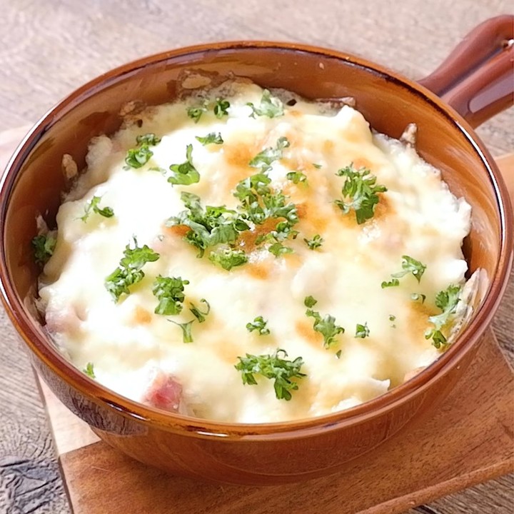 たっぷりチーズをのせて焼き上げる、お手軽リゾット風のレシピのご紹介です。ごはんで簡単にリゾットを作って、ピザ用チーズをのせてオーブントースターで焼き上げることでとろーりとろけるチーズに香ばしさが加わり、とてもおいしいですよ。玉ねぎの甘みとベーコンの旨味がとてもよいアクセントになります。