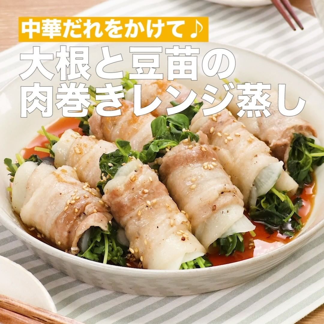 ⑤<中華だれをかけて♪大根と豆苗の肉巻きレンジ蒸し>