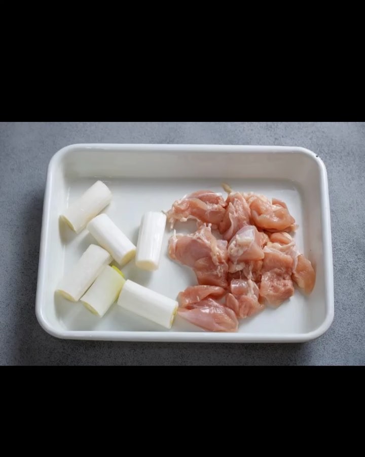 ①鶏肉は一口サイズに切り、塩こしょう少々(分量外)を揉み込む。長ネギは、3〜4cm長さのぶつ切りにする。(キッチンバサミで切れば包丁いらず♪)
