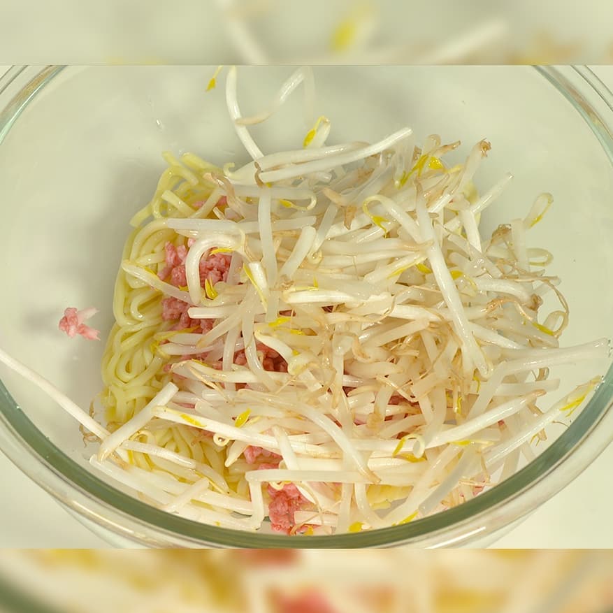 ①大きめの耐熱ボウルに焼きそば(太麺)1袋、合挽き肉(50g)もやし(100g)を入れる