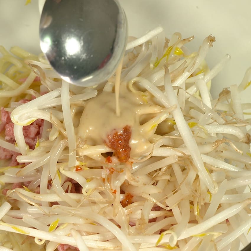 ②めんつゆ(2倍濃縮)大さじ3、豆板醤(小さじ1)牛乳(大さじ3)ごまドレッシング(大さじ3)加える