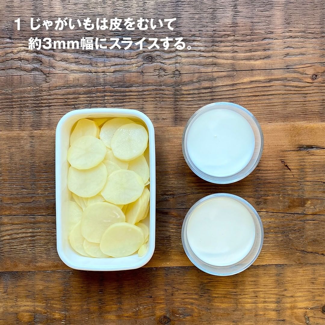 1.じゃがいもは皮をむいて約3mm幅にスライスする。