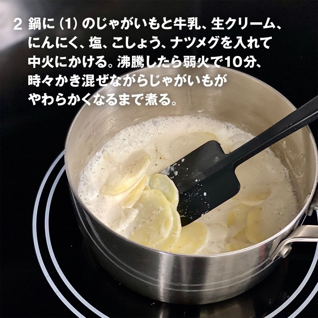 2.鍋に(1)のじゃがいもと牛乳、生クリーム、にんにく、塩、こしょう、ナツメグを入れて中火にかける。沸騰したら弱火で10分、時々かき混ぜながらじゃがいもがやわらかくなるまで煮る。