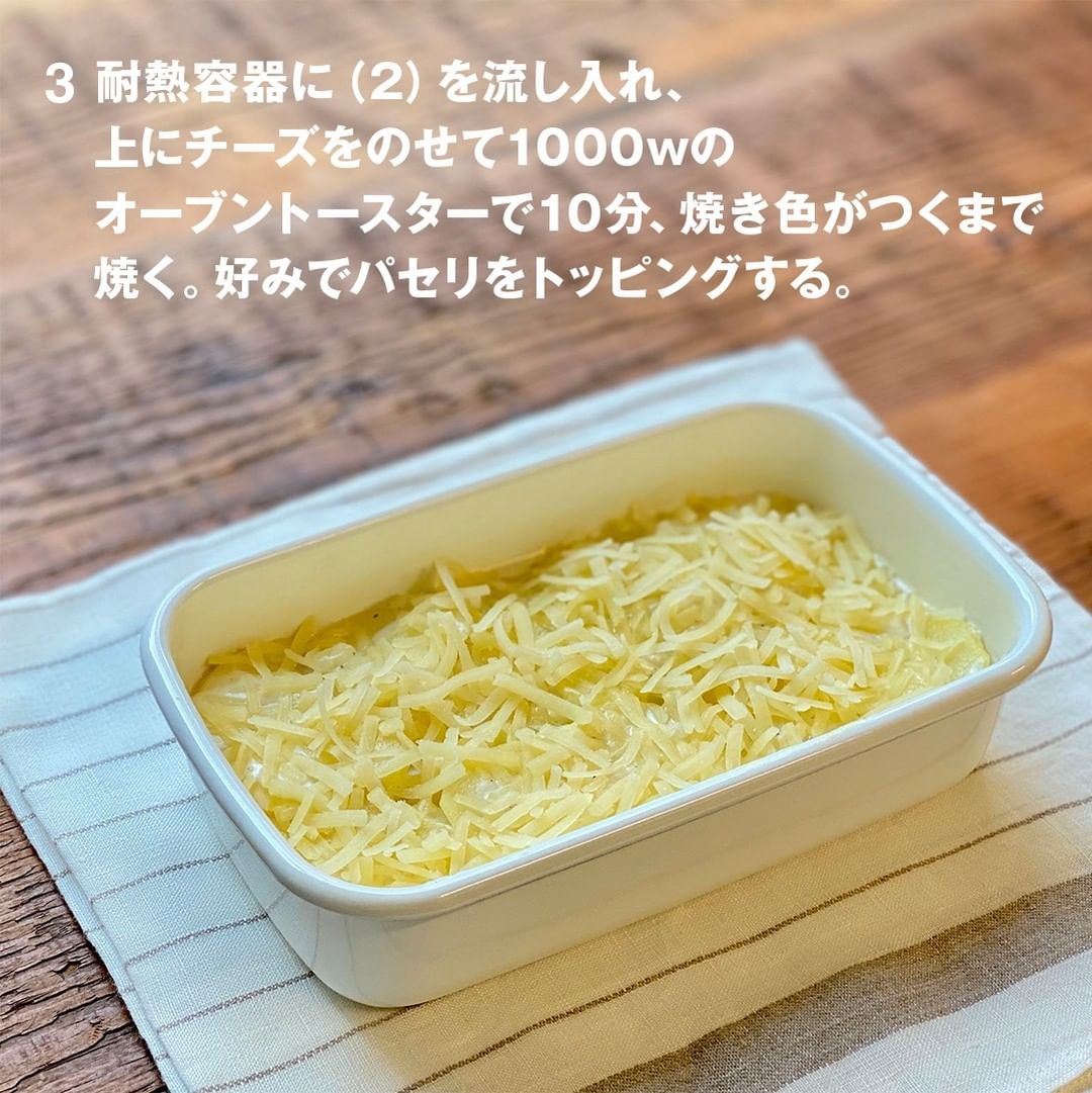 3.耐熱容器に(2)を流し入れ、上にチーズをのせて1000wのオーブントースターで10分、焼き色がつくまで焼く。好みでパセリをトッピングする。