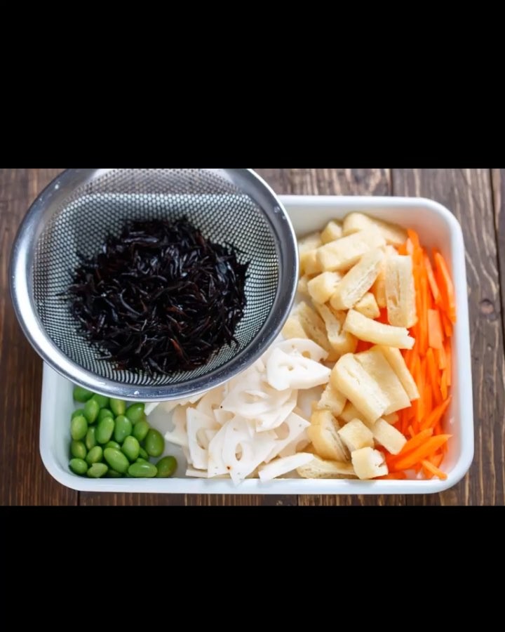 ①乾燥ひじきは、たっぷりの水で戻す。油揚げはペーパータオルで余分な油を抑え、短冊切りにする。にんじんは千切りにし、れんこんは薄いイチョウ切りにし、酢水にさらす。冷凍枝豆は鞘から出す。