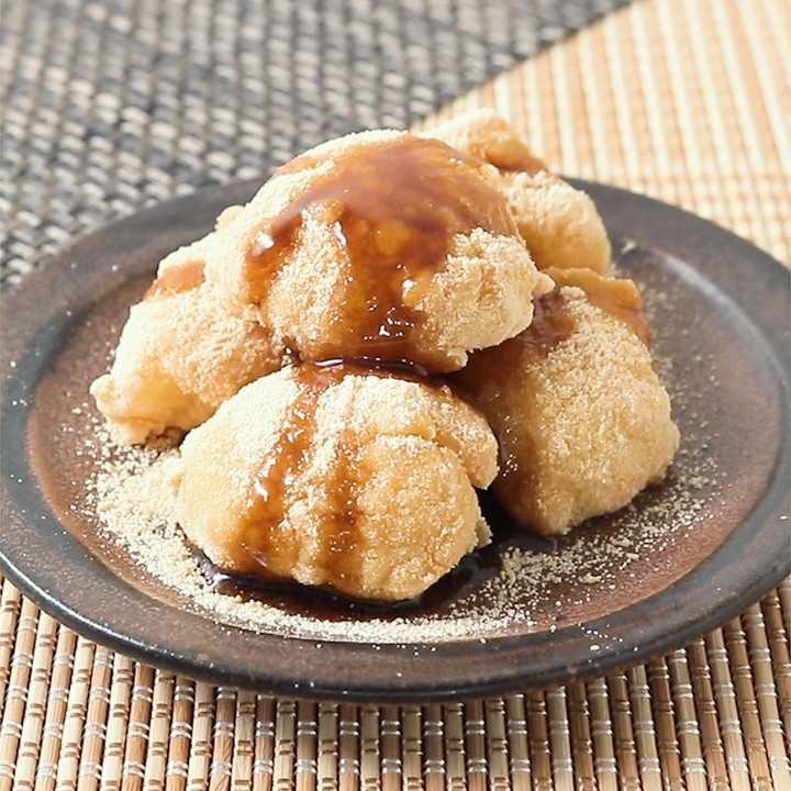 4. バットに②を入れ混ぜ合わせます。3を入れ全体にまぶしたら器に盛り付け、仕上げに黒蜜をかけて完成です。