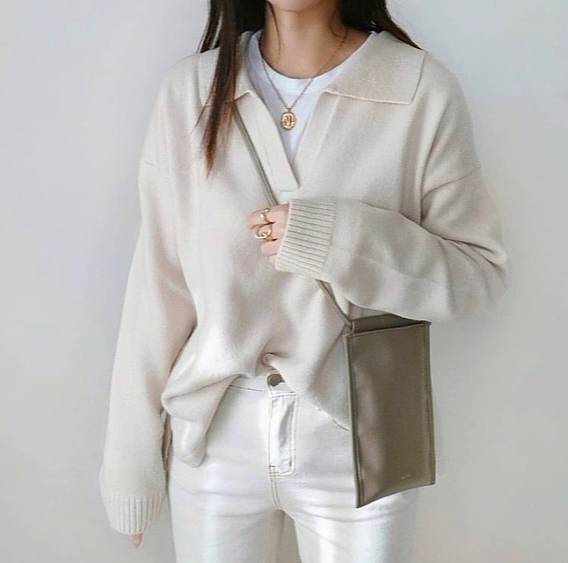 大きめのポロ襟で、顔周りをすっきり👌クルーネックのインナーとの、レイヤードもバッチリですね✨程よいゆったり感が、とっても素敵😘リラックスした、ワントーンコーデに取り入れたいセーターですね🙌