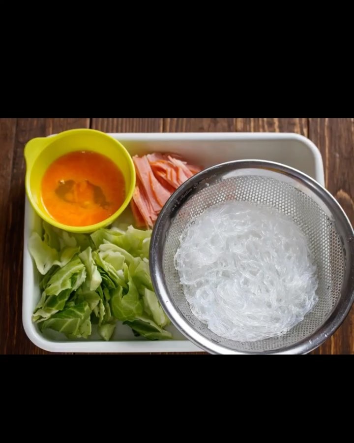 ①緑豆春雨は袋の表示通り茹でてザルにあげる。キャベツは手でちぎり、ロースハムは細切りに、卵は溶く。
