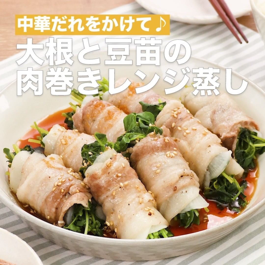 ①<中華だれをかけて♪大根と豆苗の肉巻きレンジ蒸し>