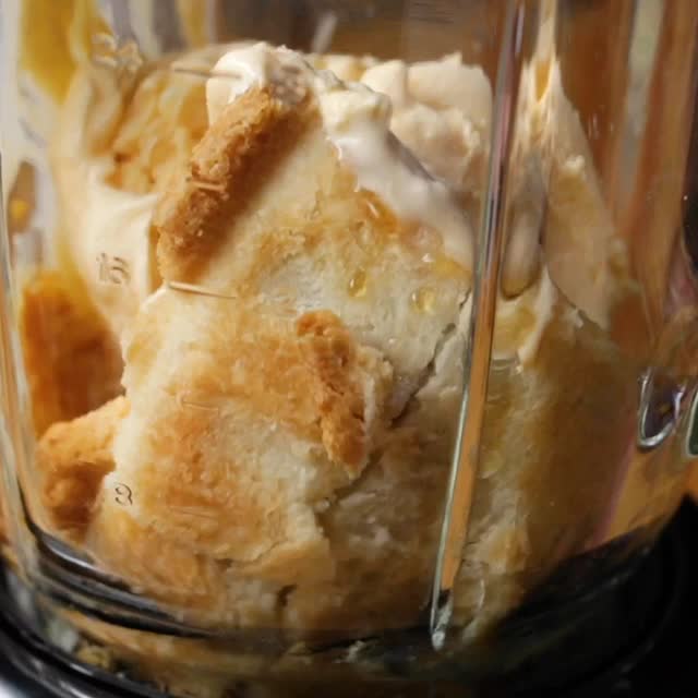 2. ブレンダーにパンプキンパイ、バニラアイス、メープルシロップ大さじ1を入れ、滑らかになるまでブレンドする。