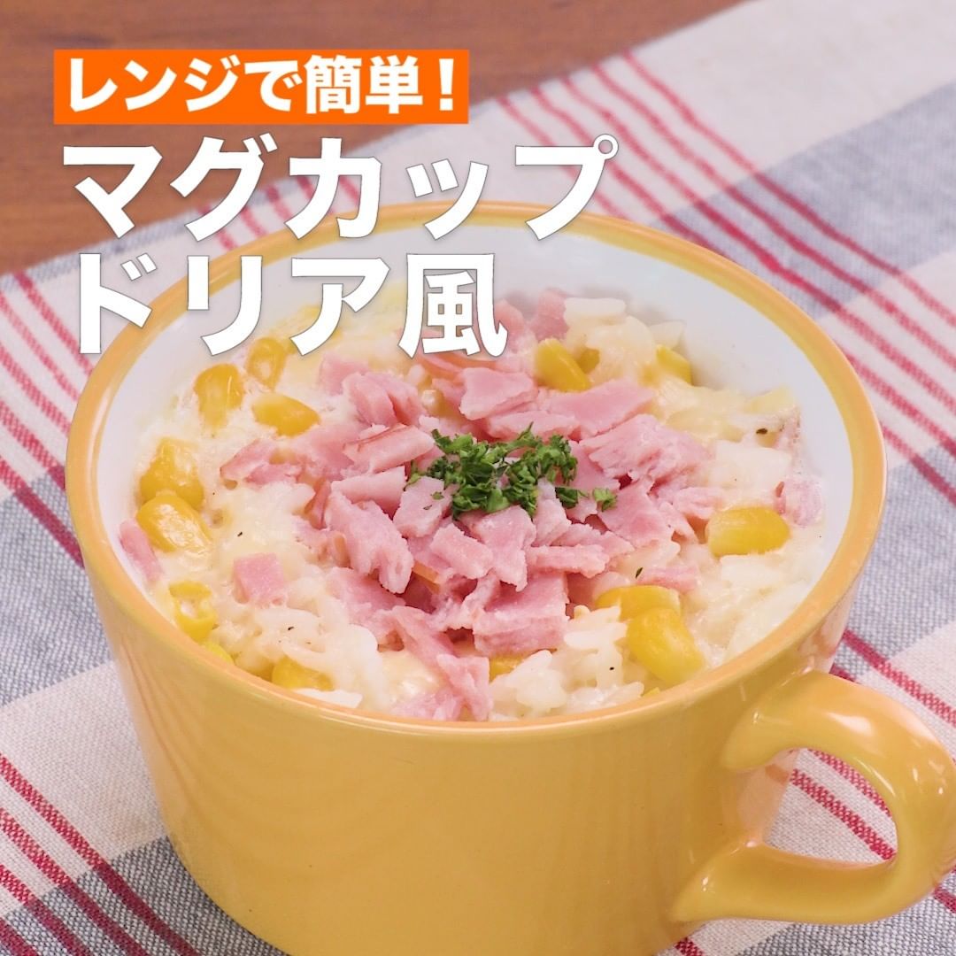 とっても簡単にマグカップひとつで仕上がる、ハムが入ったドリア風のご紹介です。材料をマグカップに入れて混ぜるだけ!包丁を使わず、とろ〜りチーズがおいしい一品があっという間に出来上がります♪