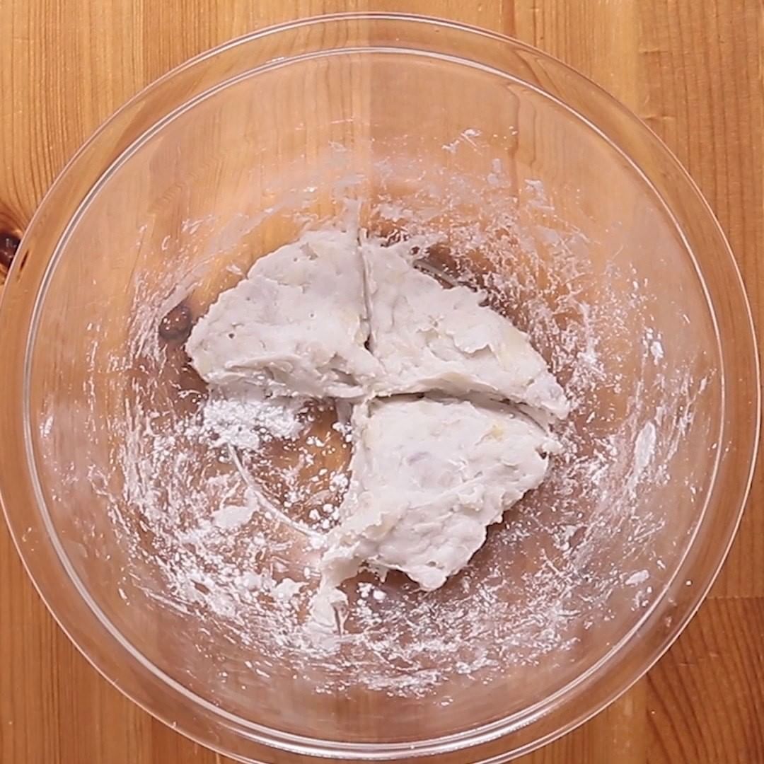 3. ①を入れ、ゴムベラでよく混ぜ合わせ4等分にし、1を包み丸く成形します。
