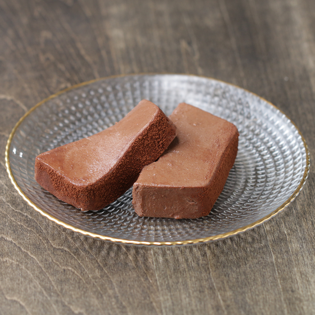 6.型から取り出してココアパウダーを振り、お好みの大きさに切り分けたら、完成!⁣