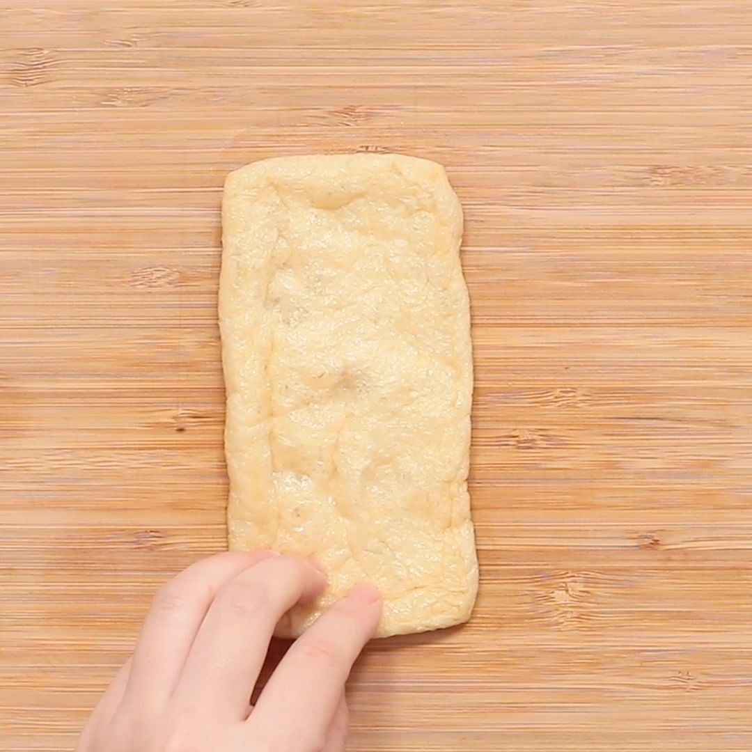 3. 油揚げは箸を転がして中を剥がしやすくして半分に切り、2を入れます。