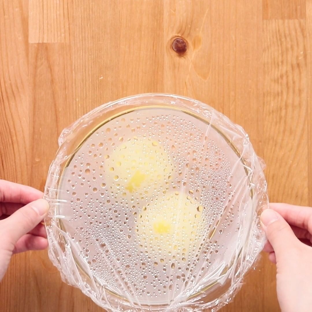 1. じゃがいもは、耐熱ボウルに入れ、ラップをし、500Wの電子レンジで5分加熱します。