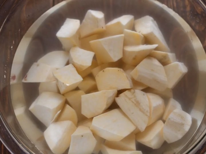 ①さつまいもは皮をむいて小さめの乱切りに、水にさらす(5〜15分程度)。