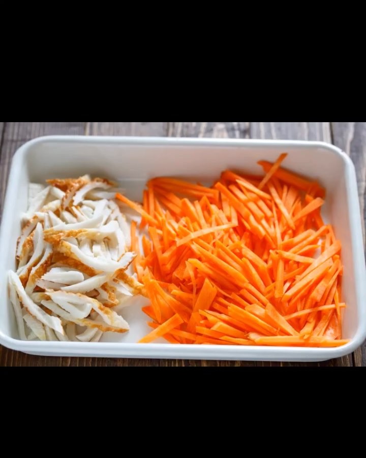 ①ちくわは縦半分に切り、さらに斜め薄切りにする。にんじんは千切りにする。