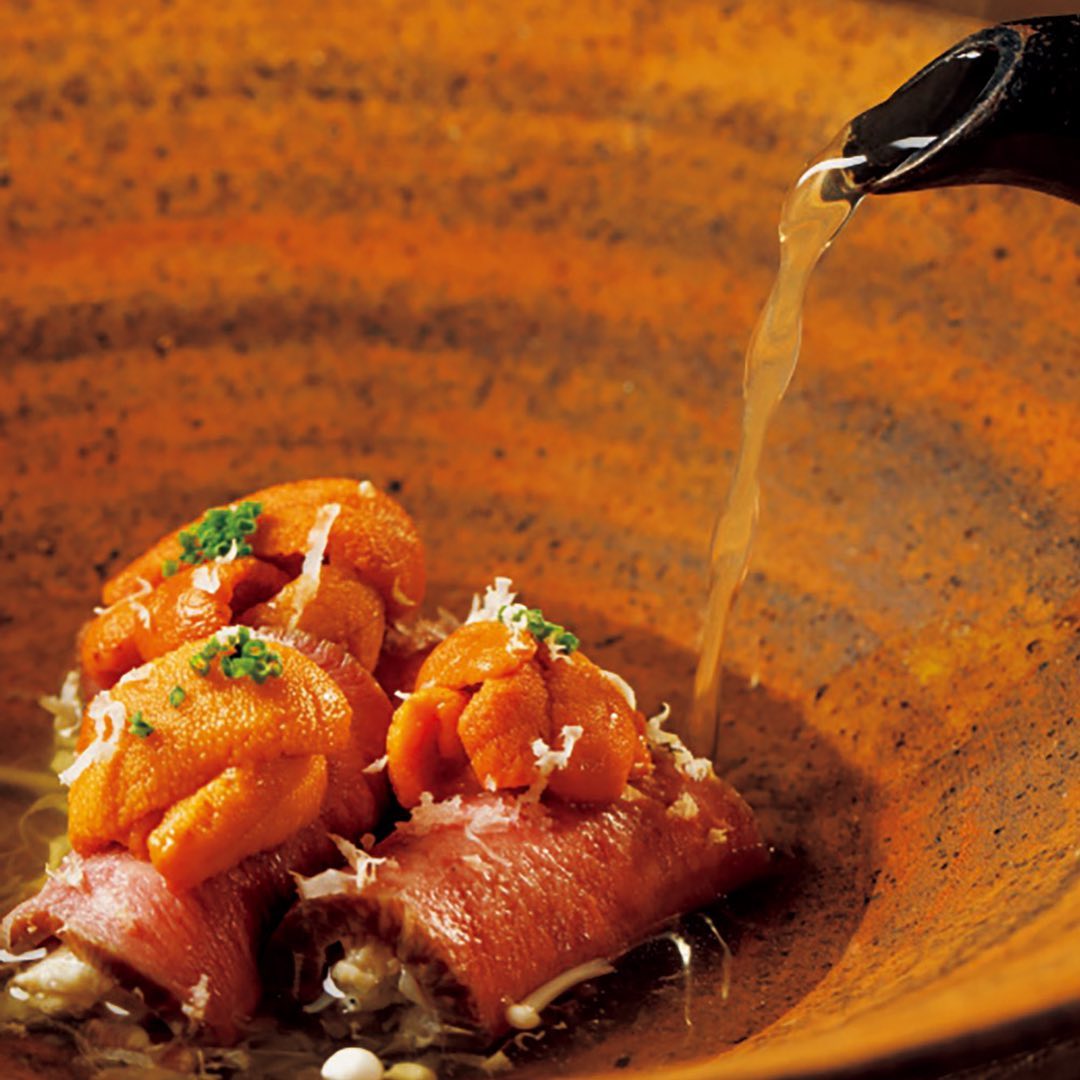 写真▷①「まずは温かい一品でリラックスを」とサーヴしたお皿には、ちりめんじゃこと湯葉を巻いて、上にウニを乗せたアンガス牛のタンが中央に。