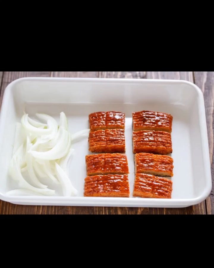 ①うな次郎は、1枚を4等分に切る。玉ねぎは薄切りにする。