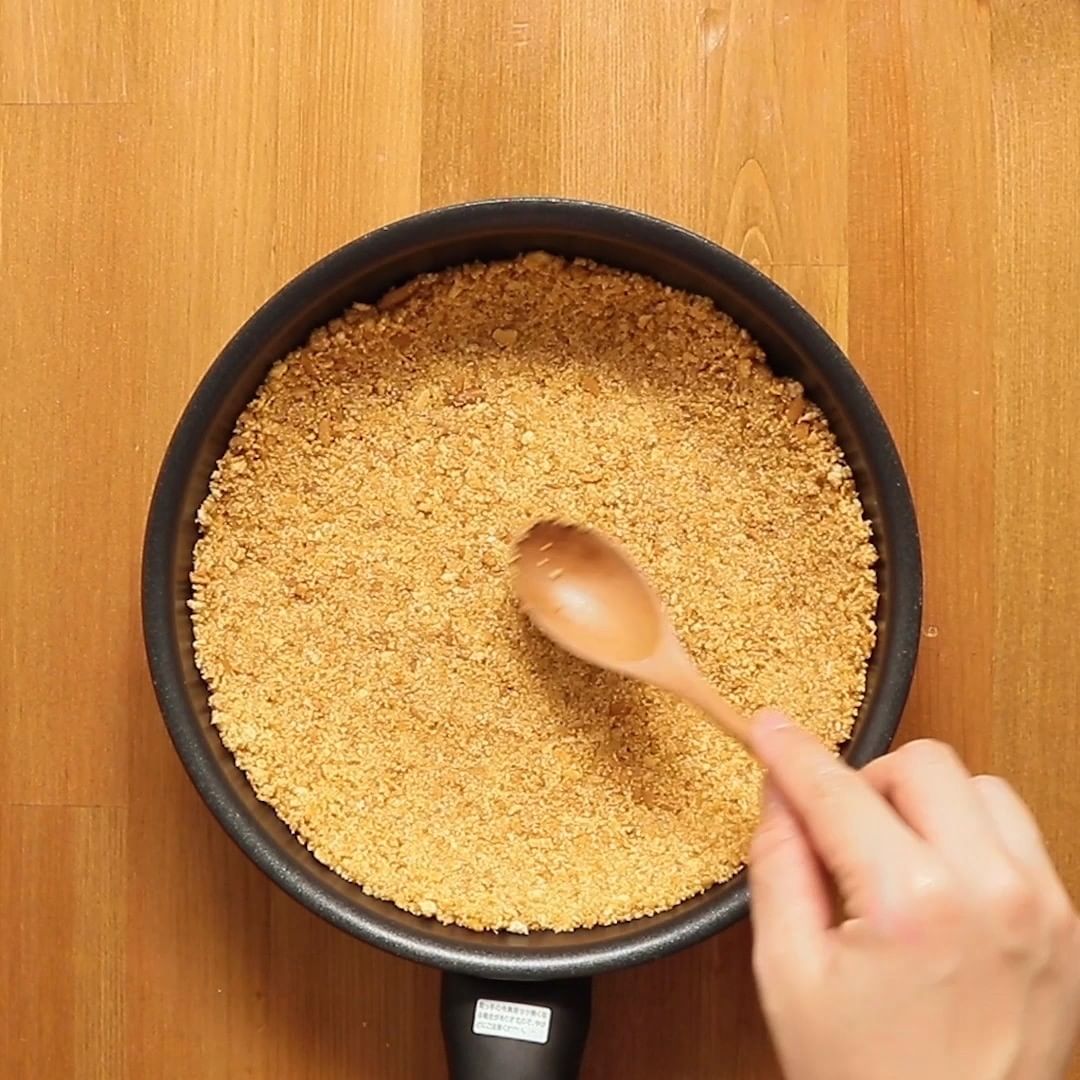 1. ジッパー付保存袋にビスケットを入れ麺棒で砕き、溶かしバターを入れ揉み込みます。フライパンに敷き詰め冷蔵庫で30分冷やします。