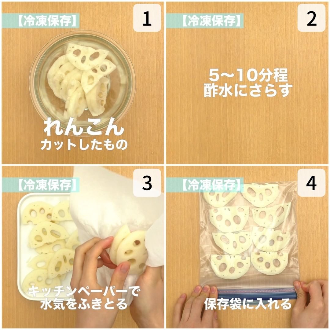 (1)ボウルにたっぷりの水、れんこん、酢を入れて5〜10分程酢水にさらし、キッチンペーパーで水気をふきとる。保存袋に入れて冷凍庫に入れる。
