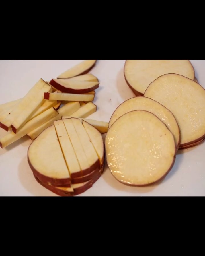 ①さつまいもは3〜5mm幅の輪切りにしてから更に細切りにし、水にさらす。