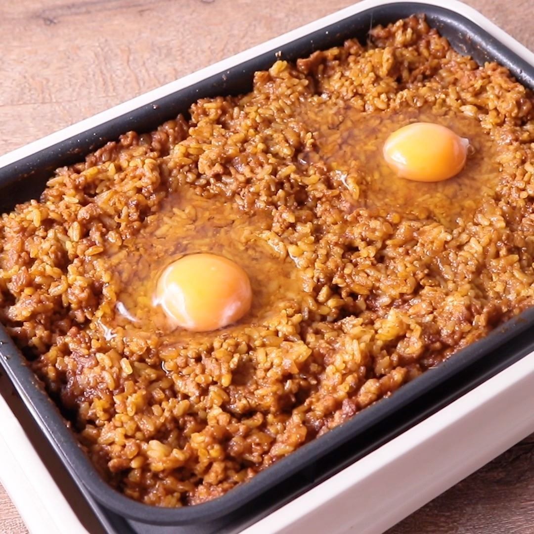 5. 水分がなくなり全体に混ざったら、くぼみを作り卵をのせて完成です。卵を崩しながらお召し上がりください。