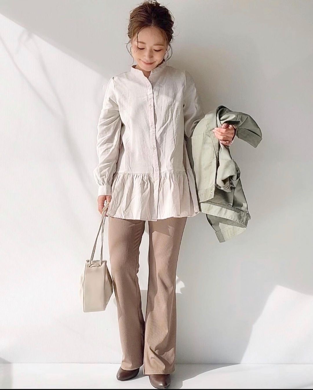 スッキリ見えするバンドカラーのデザインと、裾のギャザーが絶妙なシャツ😘一枚で良い感じなので、ちょっとしたお出かけにもぴったりですね👍テロっとした着心地が可愛い、リブスリムフレアパンツと合わせたら、フェミニンなカジュアルコーデの完成ですね✨春まで使えるアイテムです🙌