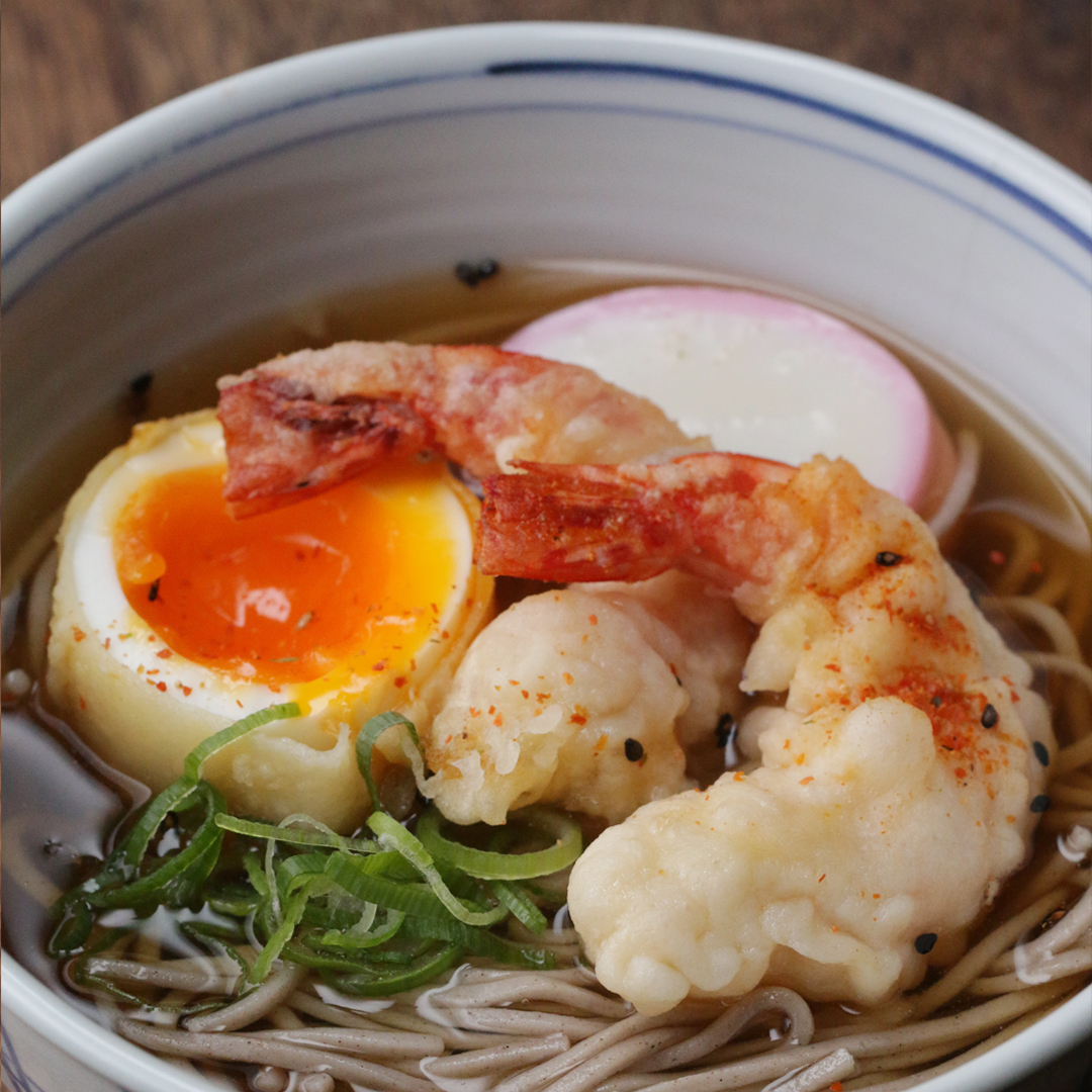 7.器に茹でたそばを入れてそばつゆを注ぎ、天ぷら、青ねぎ、かまぼこをのせたら、完成!