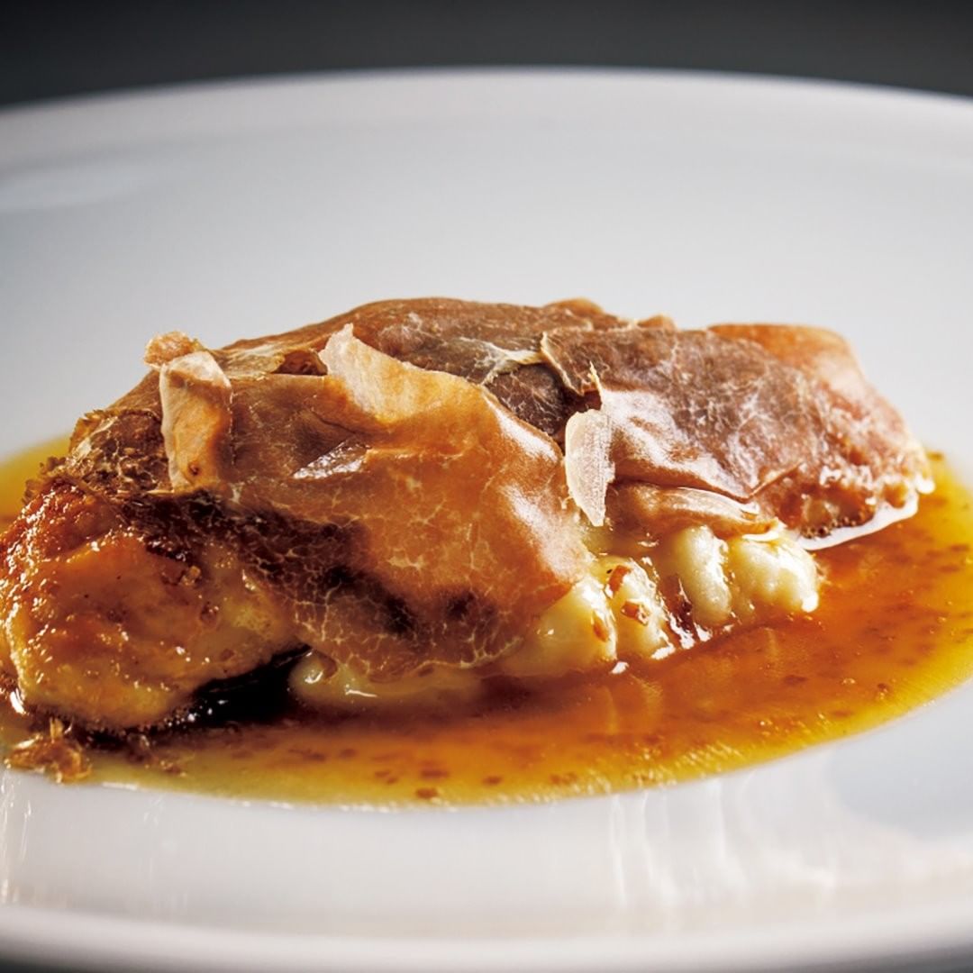 旬の白トリュフを堪能できる「トラフグの白子のポアレ根パセリと白トリュフ添え」。