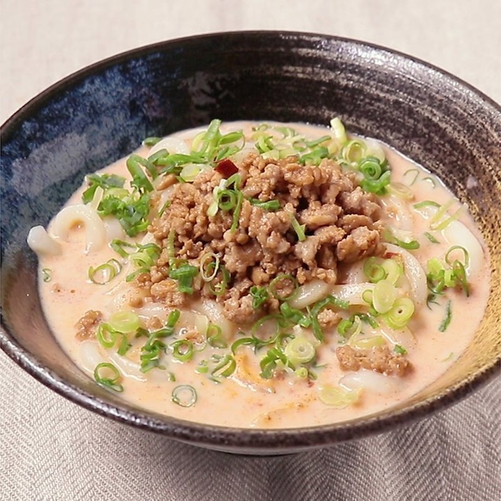 豆乳坦々うどんの紹介です。スープと肉みそに豆板醤をたっぷり使った、旨辛な一品です。豆乳の濃厚スープと、うどんの相性がぴったりです。辛さが後をひくおいしさですよ。さっと作れてとっても簡単なので、ぜひお試しください。